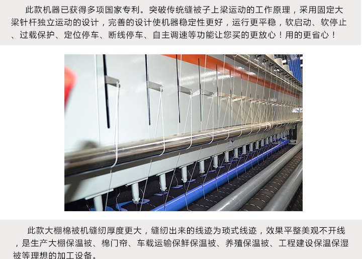 產品簡介:安徽省蕭縣徽星機械制造有限公司,已突破技術上的限制,獨立研發生產6米-8米型大棚被生產設備,領先國內同行棉被機器制造業縫制的寬度水平,在全國絕無第二家的大棚被生產設備,動力選用三項雙電機驅動,轉速可達140針/分鐘進行縫合,針距可調整到1-4公分,縫紉厚度可達到3-5公分,每平方米重量達8公斤。